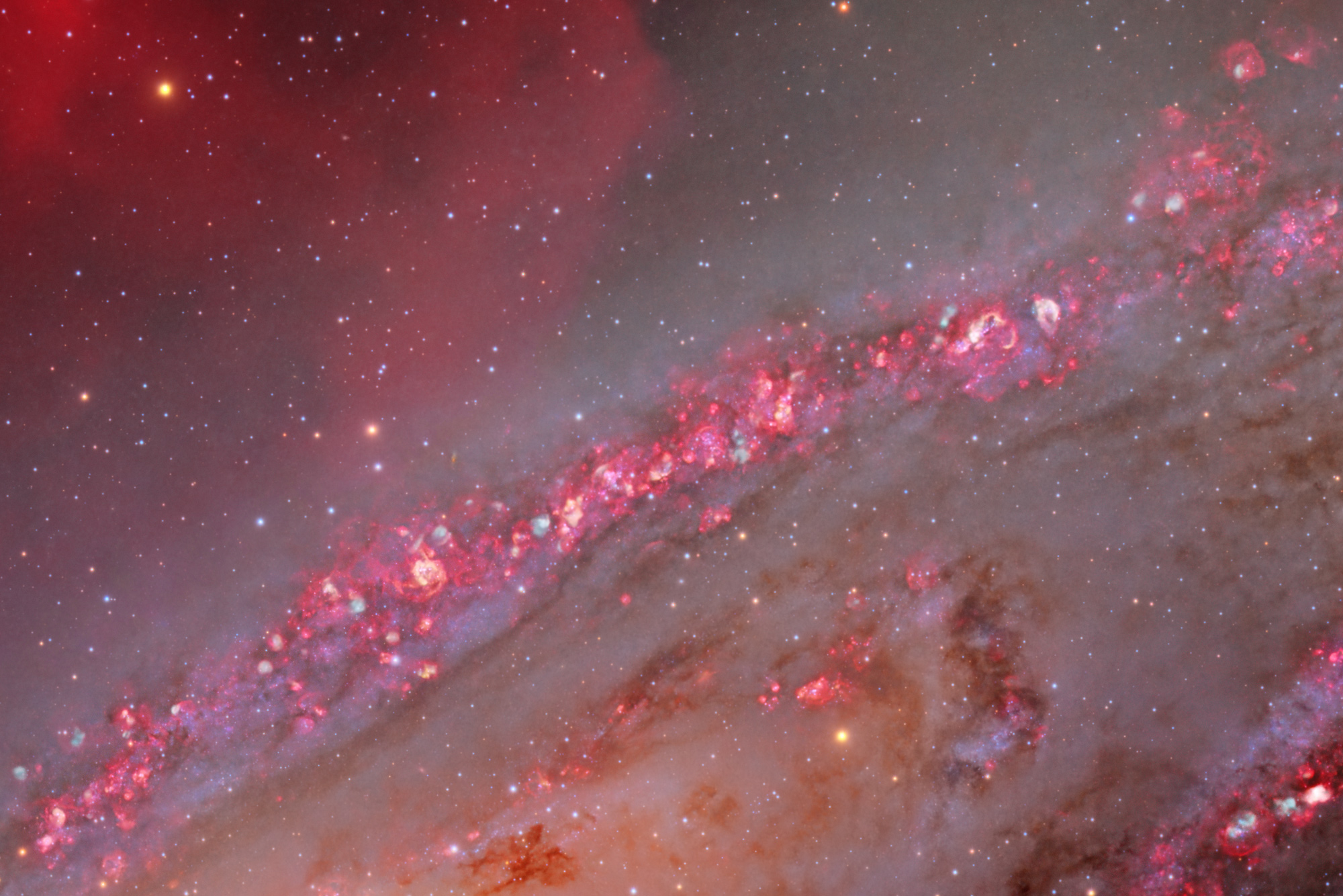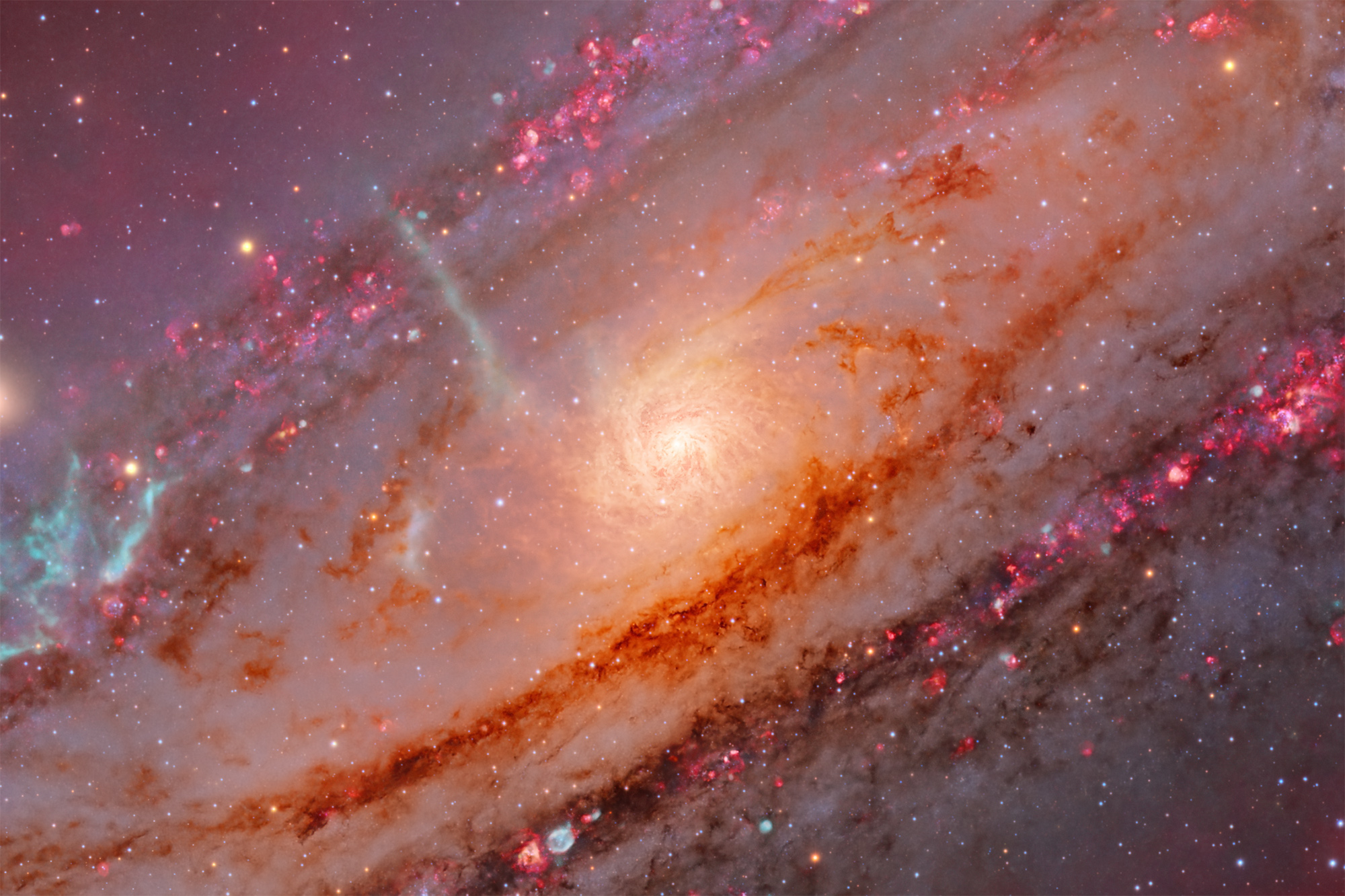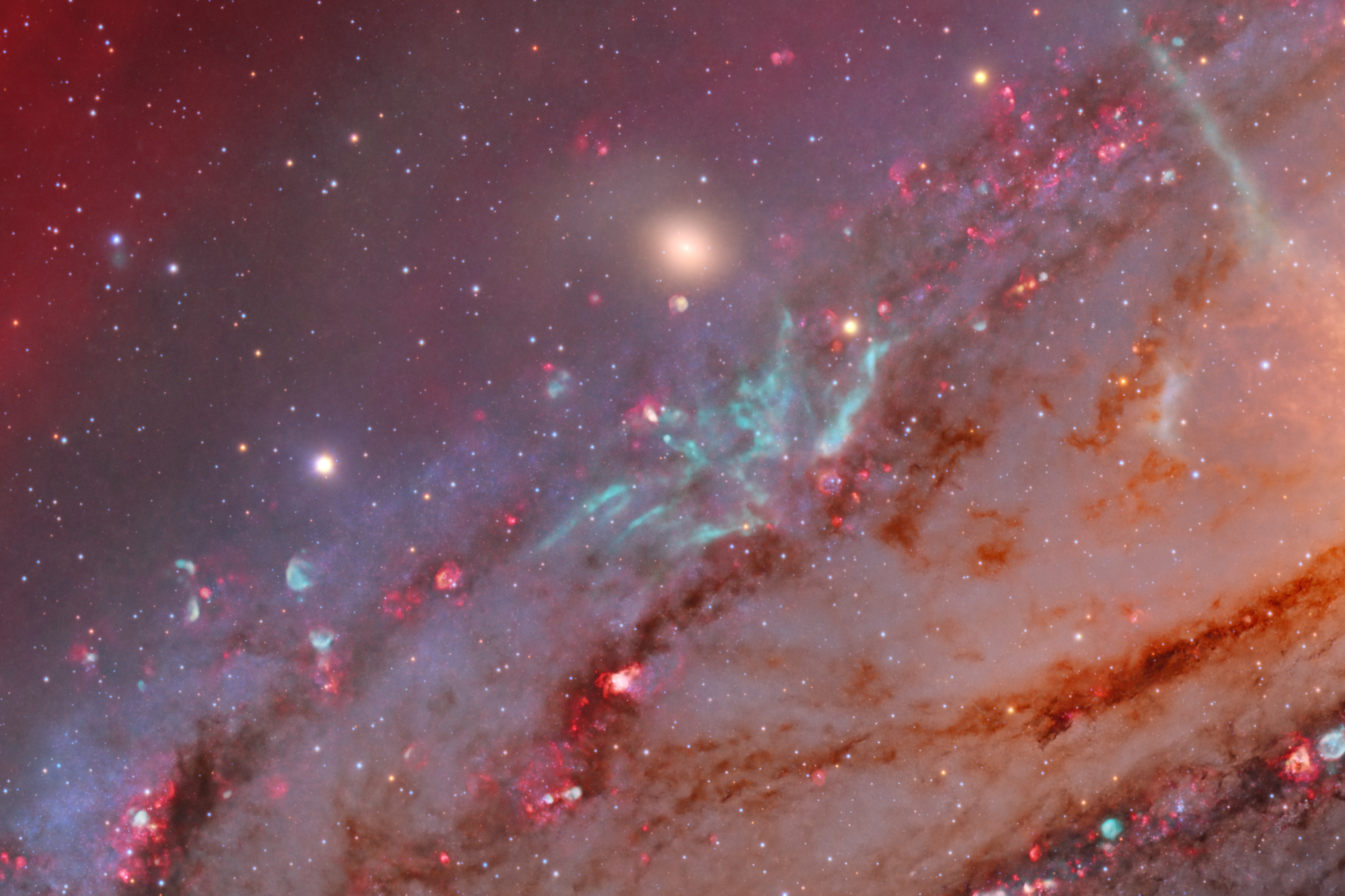 This galaxy, M31, is often imaged by planet Earth-based astronomers. As the nearest large spiral galaxy, it is a familiar sight with dark dust lanes, bright yellowish core, and spiral arms traced by clouds of bright blue stars. A mosaic of well-exposed broad and narrow-band image data, this deep portrait of our neighboring island universe offers strikingly unfamiliar features though, faint reddish clouds of glowing ionized hydrogen gas in the same wide field of view. Most of the ionized hydrogen clouds surely lie in the foreground of the scene, well within our Milky Way Galaxy. They are likely associated with the pervasive, dusty interstellar cirrus clouds scattered hundreds of light-years above our own galactic plane. Some of the clouds, however, occur right in the Andromeda galaxy itself, and some in M110, the small galaxy just below.
