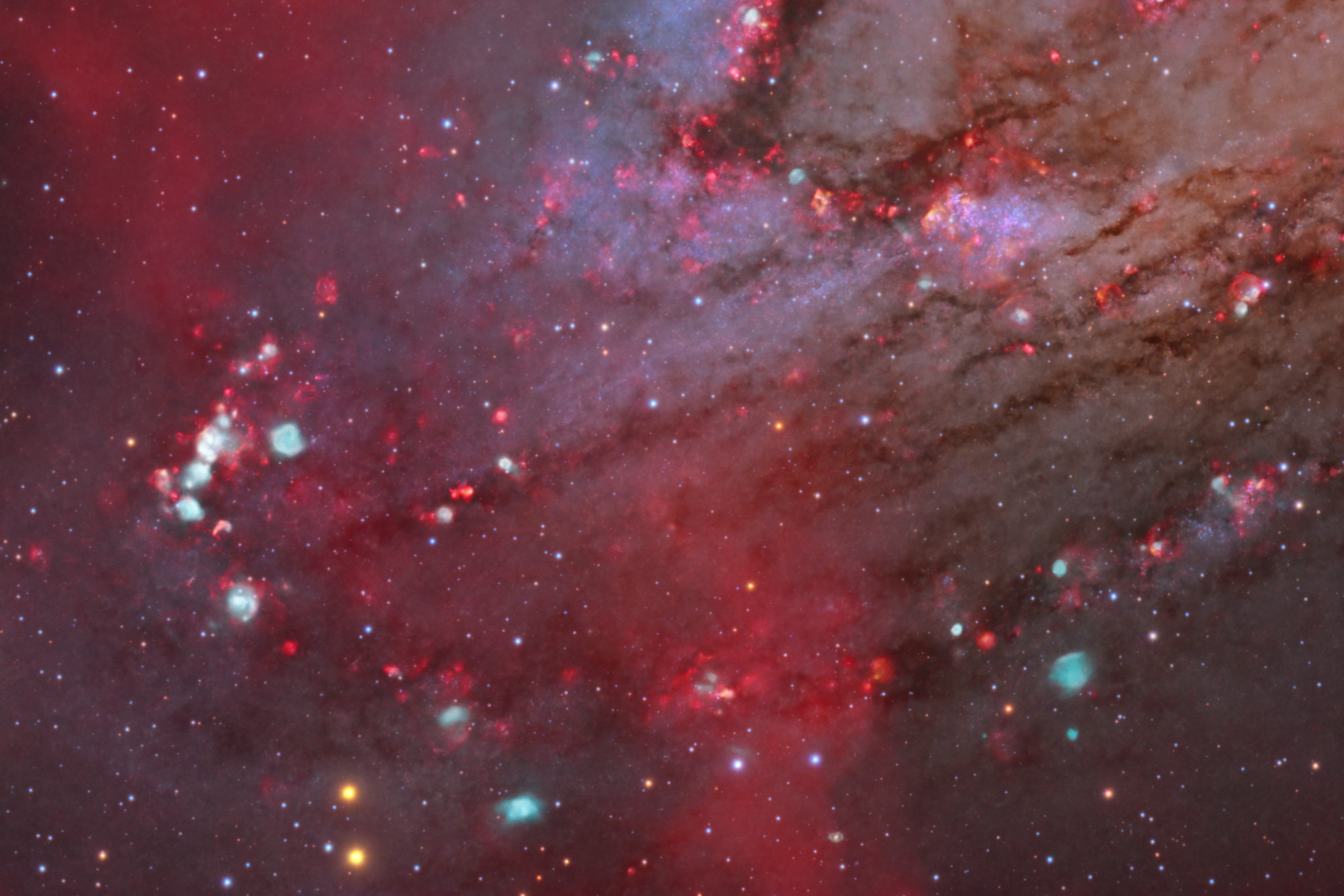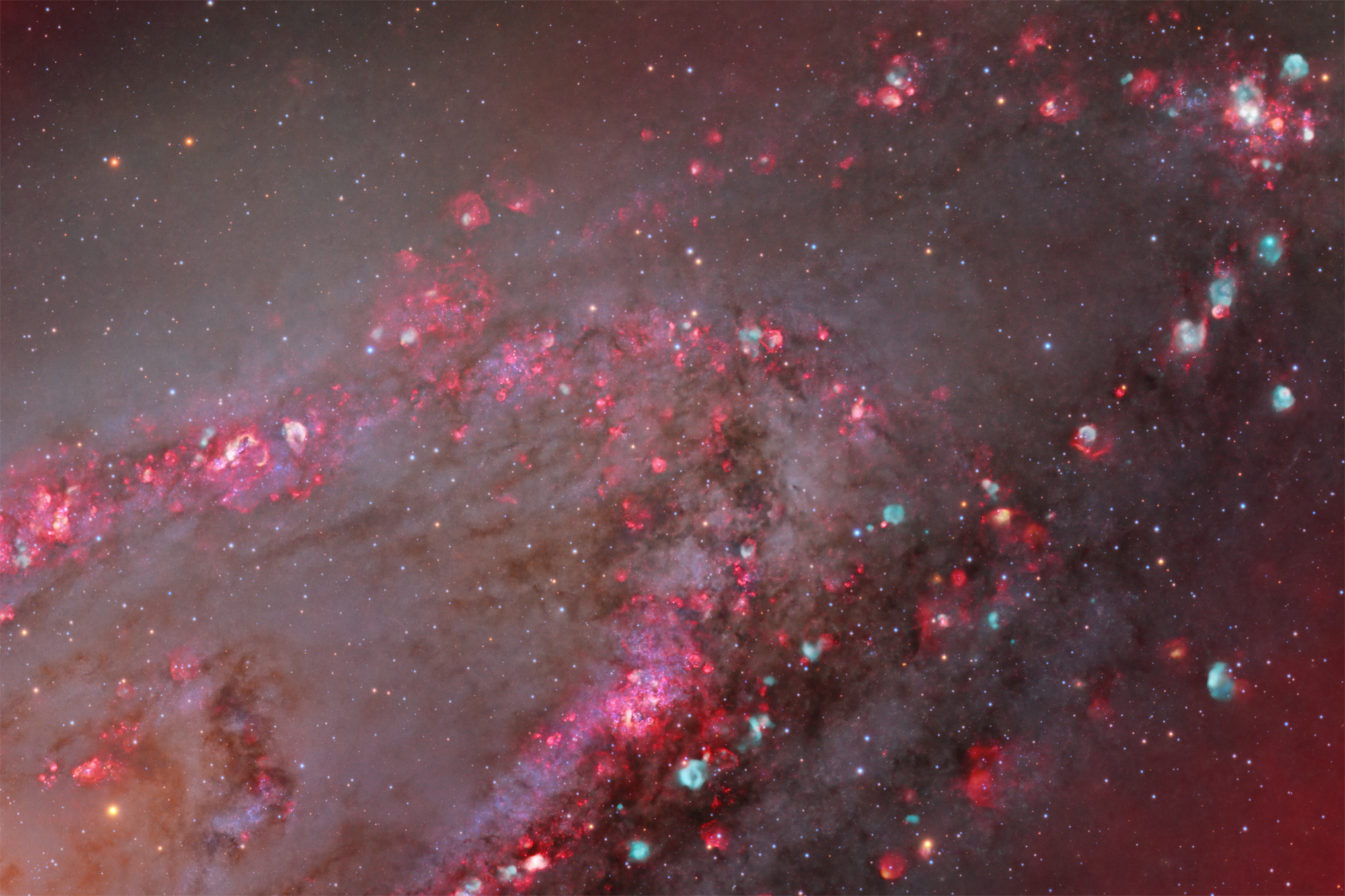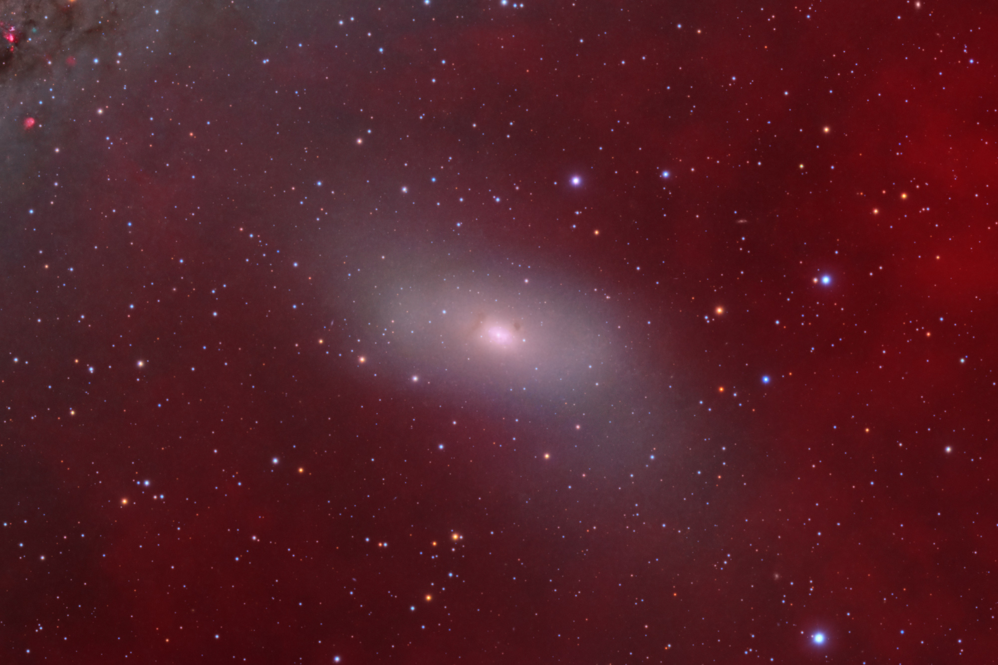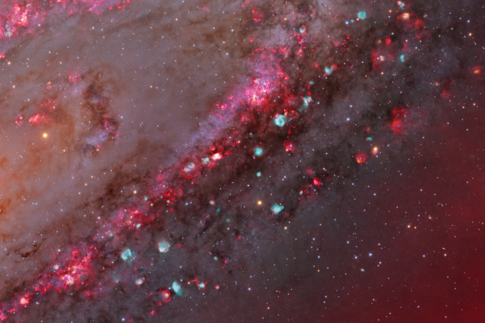 This galaxy, M31, is often imaged by planet Earth-based astronomers. As the nearest large spiral galaxy, it is a familiar sight with dark dust lanes, bright yellowish core, and spiral arms traced by clouds of bright blue stars. A mosaic of well-exposed broad and narrow-band image data, this deep portrait of our neighboring island universe offers strikingly unfamiliar features though, faint reddish clouds of glowing ionized hydrogen gas in the same wide field of view. Most of the ionized hydrogen clouds surely lie in the foreground of the scene, well within our Milky Way Galaxy. They are likely associated with the pervasive, dusty interstellar cirrus clouds scattered hundreds of light-years above our own galactic plane. Some of the clouds, however, occur right in the Andromeda galaxy itself, and some in M110, the small galaxy just below.