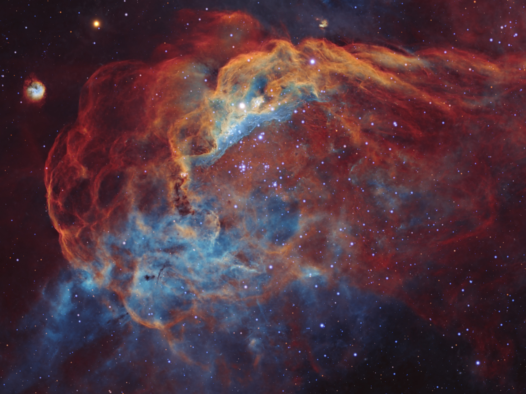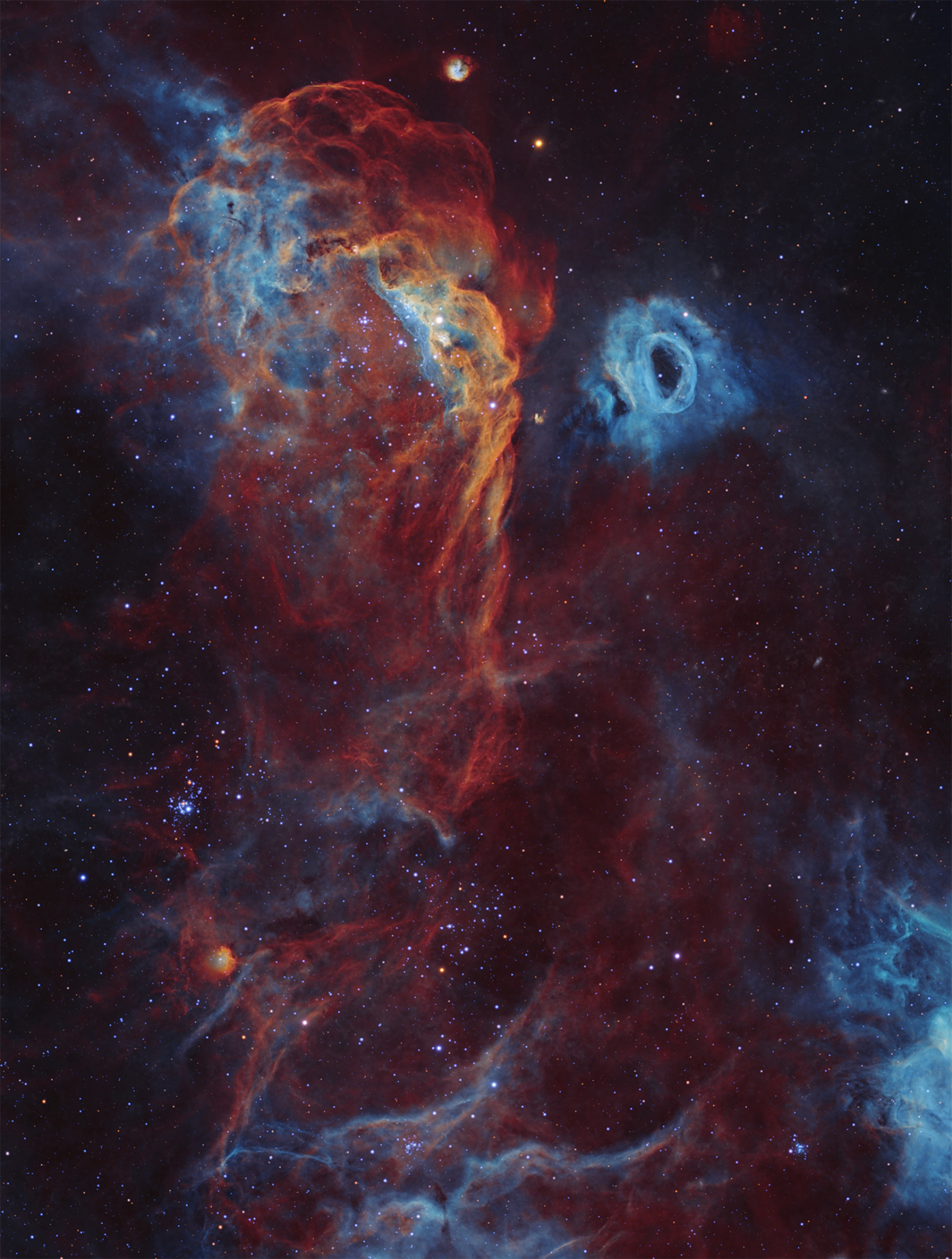 These bright ridges of interstellar gas and dust are bathed in energetic starlight. With its sea of young stars, the massive star-forming region NGC 2014 has been dubbed the Cosmic Reef. Drifting just off shore, the smaller NGC 2020, is an expansive blue-hued structure erupting from a single central Wolf-Rayet star, 200,000 times brighter than the Sun. The cosmic frame spans some 600 light-years within the Large Magellanic Cloud 160,000 light-years away, a satellite galaxy of our Milky Way.