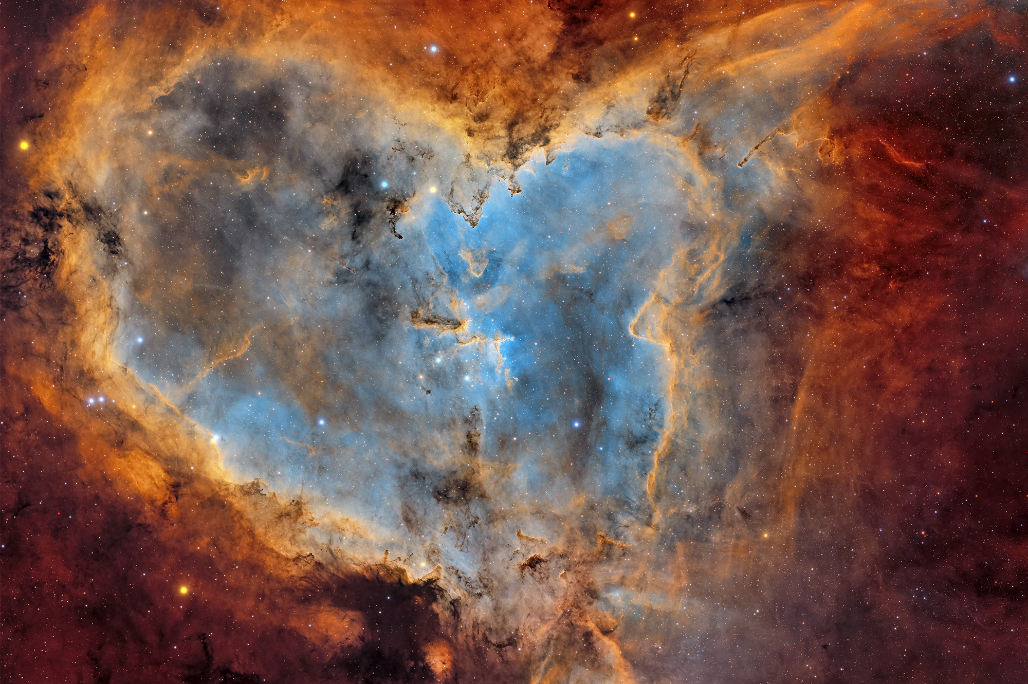First, the large emission nebula dubbed IC 1805 looks, in whole, like a human heart. The nebula glows brightly in red light emitted by its most prominent element: hydrogen. The red glow and the larger shape are all powered by a small group of stars near the nebula’s center. In the center