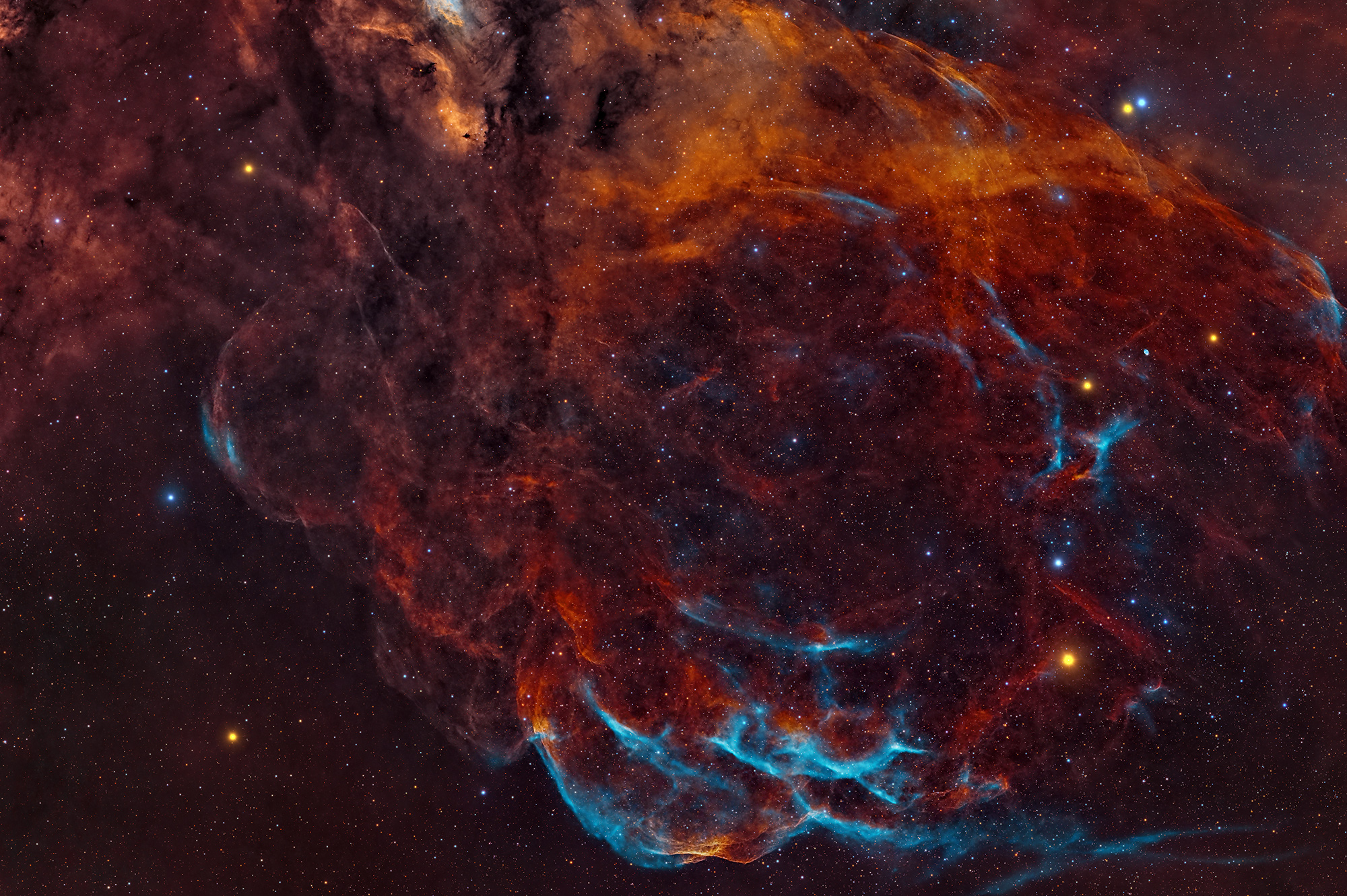 a faint supernova remnant located nearby that is the result of a massive star’s explosion, which expelled its outer layers into space. This remnant has an elongated, irregular shape and is characterized by diffuse, low surface brightness, making it less conspicuous than some other nebulae.