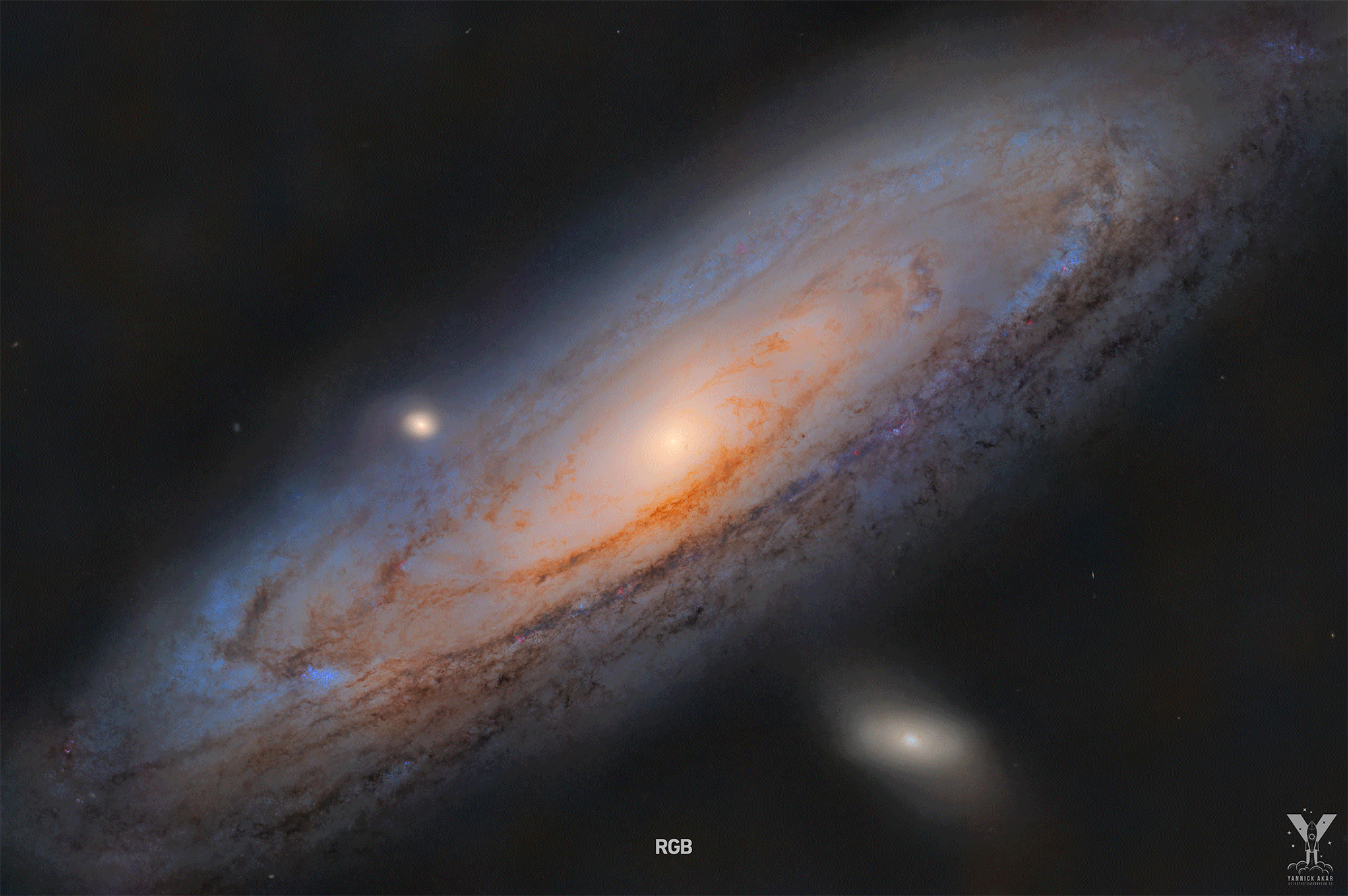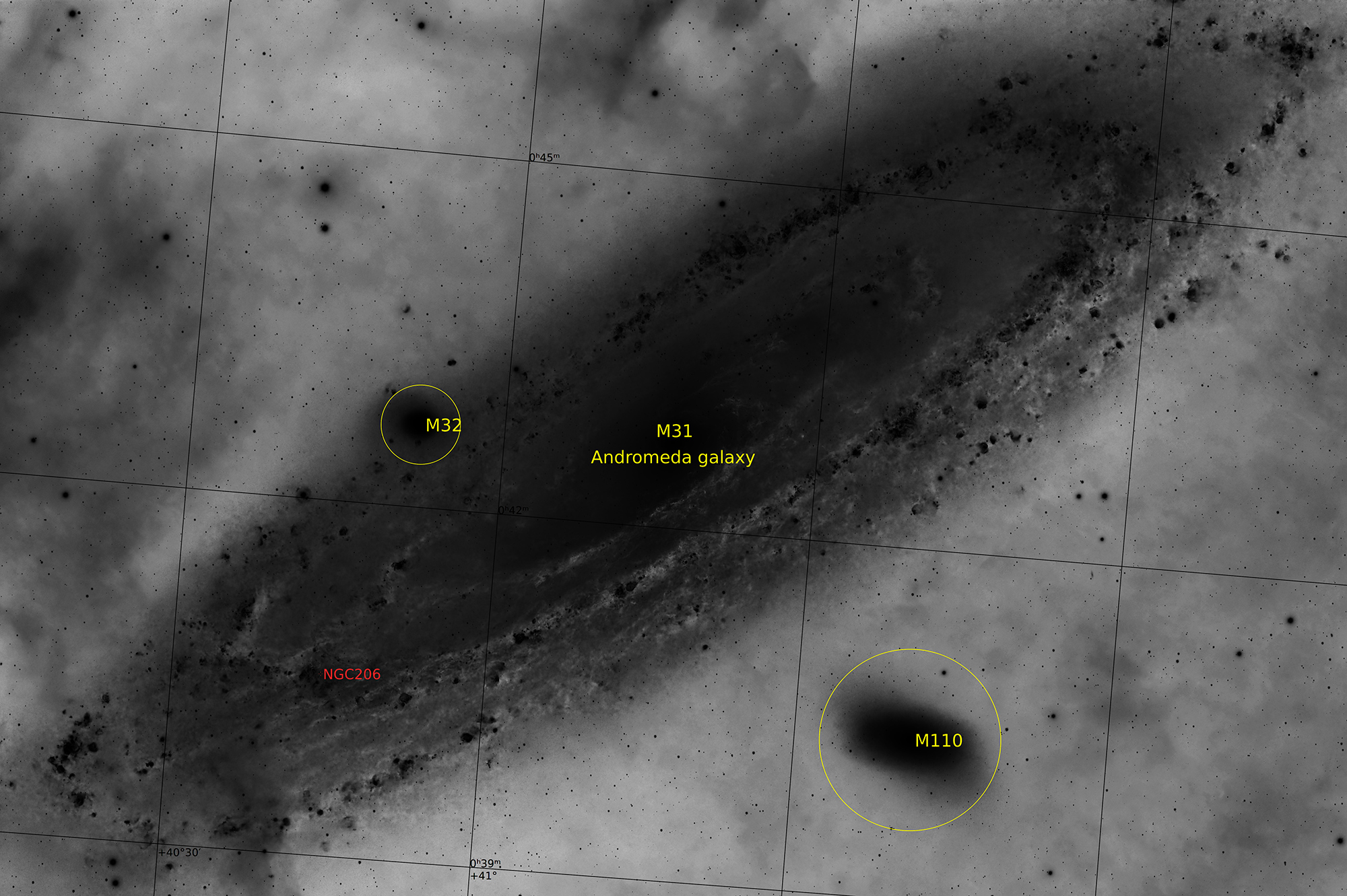 What are those red clouds surrounding the Andromeda galaxy? This galaxy, M31, is often imaged by planet Earth-based astronomers. As the nearest large spiral galaxy, it is a familiar sight with dark dust lanes, bright yellowish core, and spiral arms traced by clouds of bright blue stars. A mosaic of well-exposed broad and narrow-band image data, this deep portrait of our neighboring island universe offers strikingly unfamiliar features though, faint reddish clouds of glowing ionized hydrogen gas in the same wide field of view. Most of the ionized hydrogen clouds surely lie in the foreground of the scene, well within our Milky Way Galaxy. They are likely associated with the pervasive, dusty interstellar cirrus clouds scattered hundreds of light-years above our own galactic plane. Some of the clouds, however, occur right in the Andromeda galaxy itself, and some in M110, the small galaxy just below.