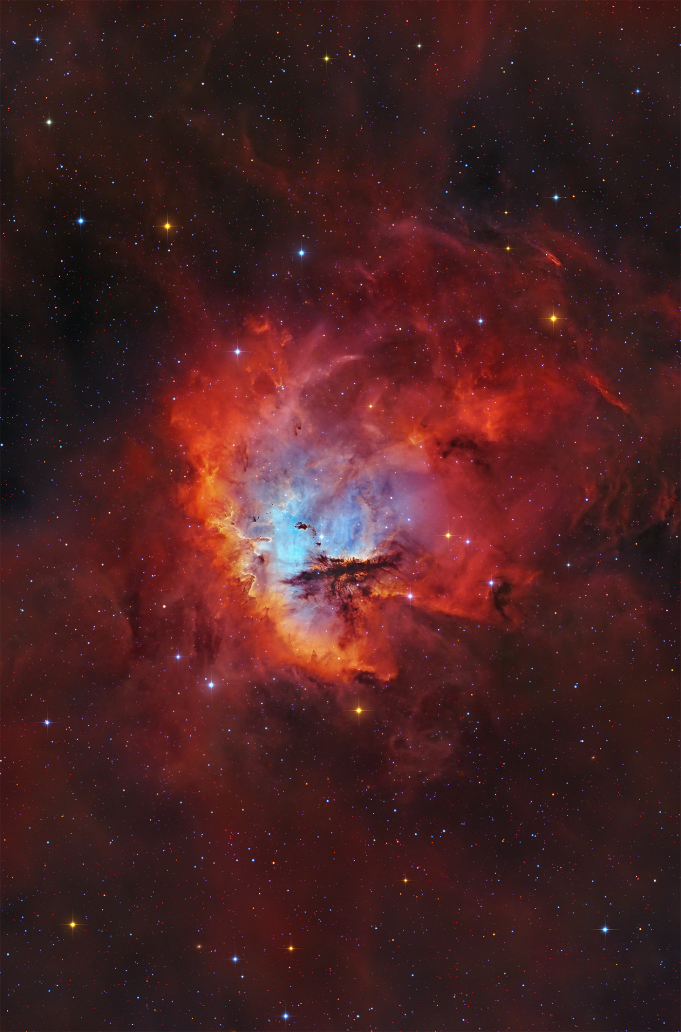 Look through the cosmic cloud cataloged as NGC 281 and you might miss the stars of open cluster IC 1590. Still, formed within the nebula that cluster’s young, massive stars ultimately power the pervasive nebular glow. The eye-catching shapes looming in this portrait of NGC 281 are sculpted dusty columns and dense Bok globules seen in silhouette, eroded by intense, energetic winds and radiation from the hot cluster stars. If they survive long enough, the dusty structures could also be sites of future star formation. Playfully called the Pacman Nebula because of its overall shape, NGC 281 is about 10,000 light-years away in the constellation Cassiopeia. This sharp composite image was made through narrow-band filters with the addition of true color stars. It combines emission from the nebula’s hydrogen, oxygen and sulfur atoms to synthesize red, green, and blue colors. The scene spans well over 80 light-years at the estimated distance of NGC 281.